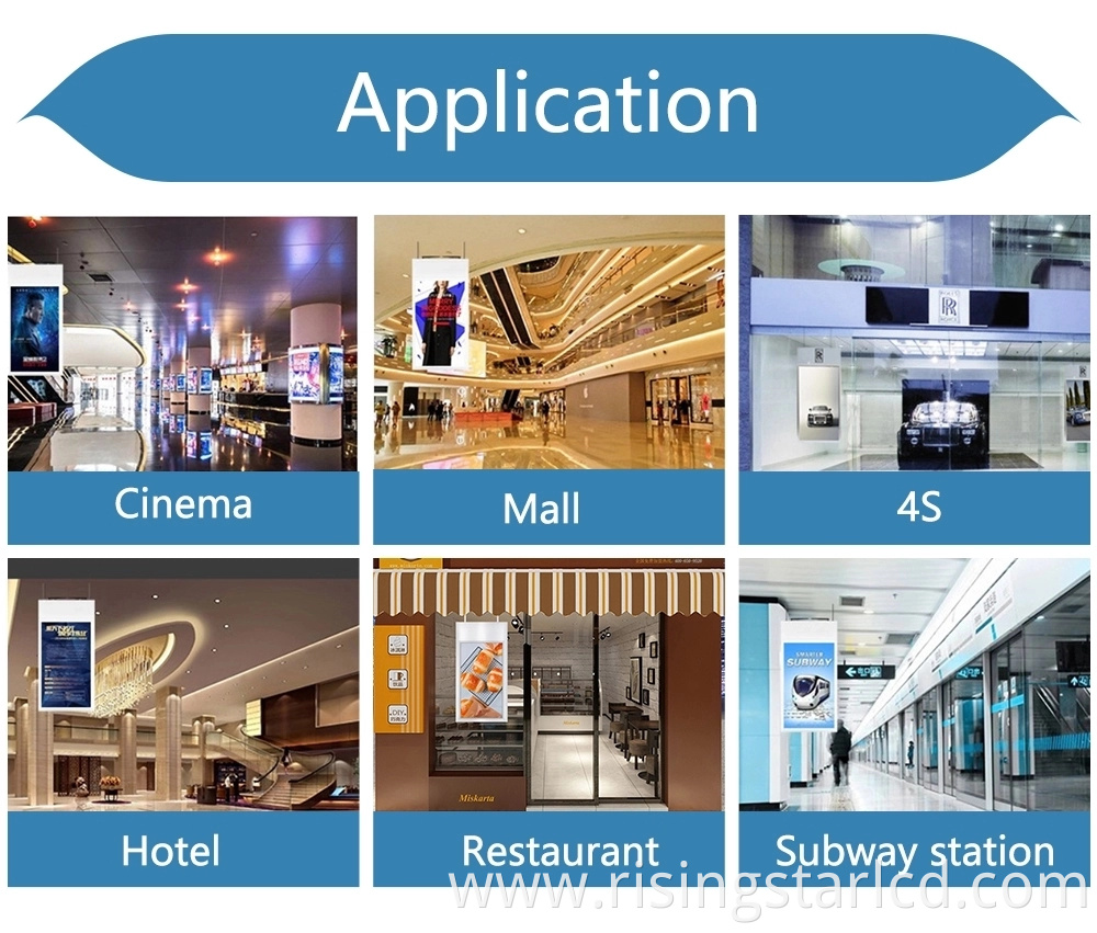 Daylight visiable display with vertical and horizontal display optional.It can be installed inside the shop store.retails,shopping mall . Hanging window display with the special heat dissipation process can reduce the noise of the panel in use, so as to achieve the mode of low power consumption, low noise and high-definition picture .