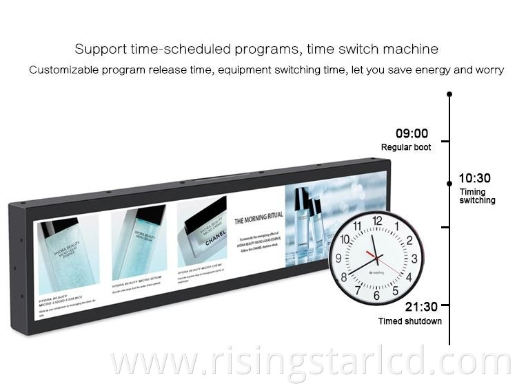 Supermarket Shelf LCD Advertising Display ,23 inch Ultra Wide Monitor Screen Stretched Bar Type LCD Advertising Display.shelf LCD advertising display use Stretch LCD Display monitor,The brithtness 500 nits,This modle support time-scheduled programs according to the customer requirement. Support horizontal and vertical displays.