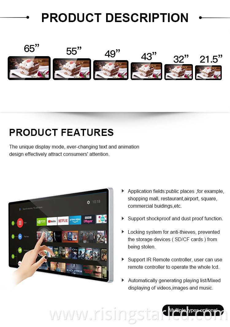 Application fields:public places ,for example, shopping mall, restaurant,airport, square, commercial buidings,etc. Support shockproof and dust proof function.> Locking system for anti-thieves, prevented the storage devices ( SD/CF cards ) from being stolen. Support IR Remote controller, user can use remote controller to operate the whole Icd. Automatically generating playing list/Mixed displaying of videos,images and music.